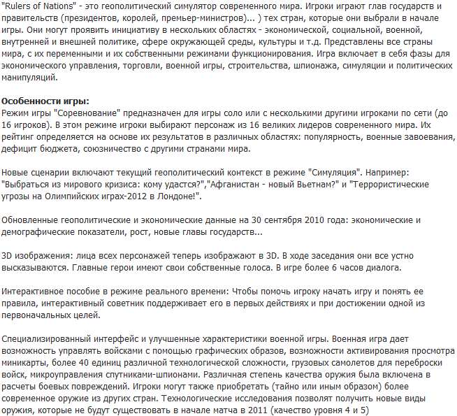 Название: Правители наций. Геополитический симулятор 2 (Rulers Of Nations. Geo-Political Simulator 2) Год выпуска: 2011 Жанр: Strategy (Real-time / Grand strategy), Top-down Тип издания: Repack Язык интерфейса: русский Платформа: PC